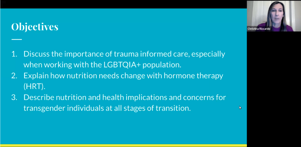 Registered Dietitians, Christina Riccardo and Anthony Dissen, discuss the importance of trauma informed care, especially when working with the LGBTQIA+ population. This webinar explores how nutrition needs change with hormone therapy, and describes nutrition and health implications and concerns for transgender individuals at all stages of transition.