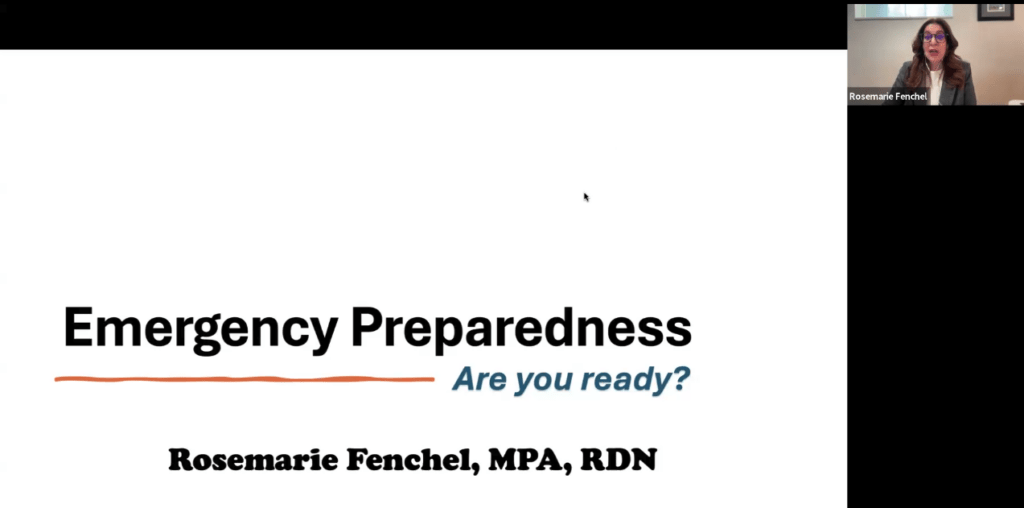 Rosemarie Fenchel, RDN, defines emergency preparedness and the various types of emergencies, while developing a general emergency plan to meet basic needs. She focuses on planning emergency meals, practicing response strategies, and guiding clients and patients on how to prepare for emergencies. Additionally, this webinar explores nutritional needs during emergencies and how to leverage additional resources to support effective emergency preparedness.